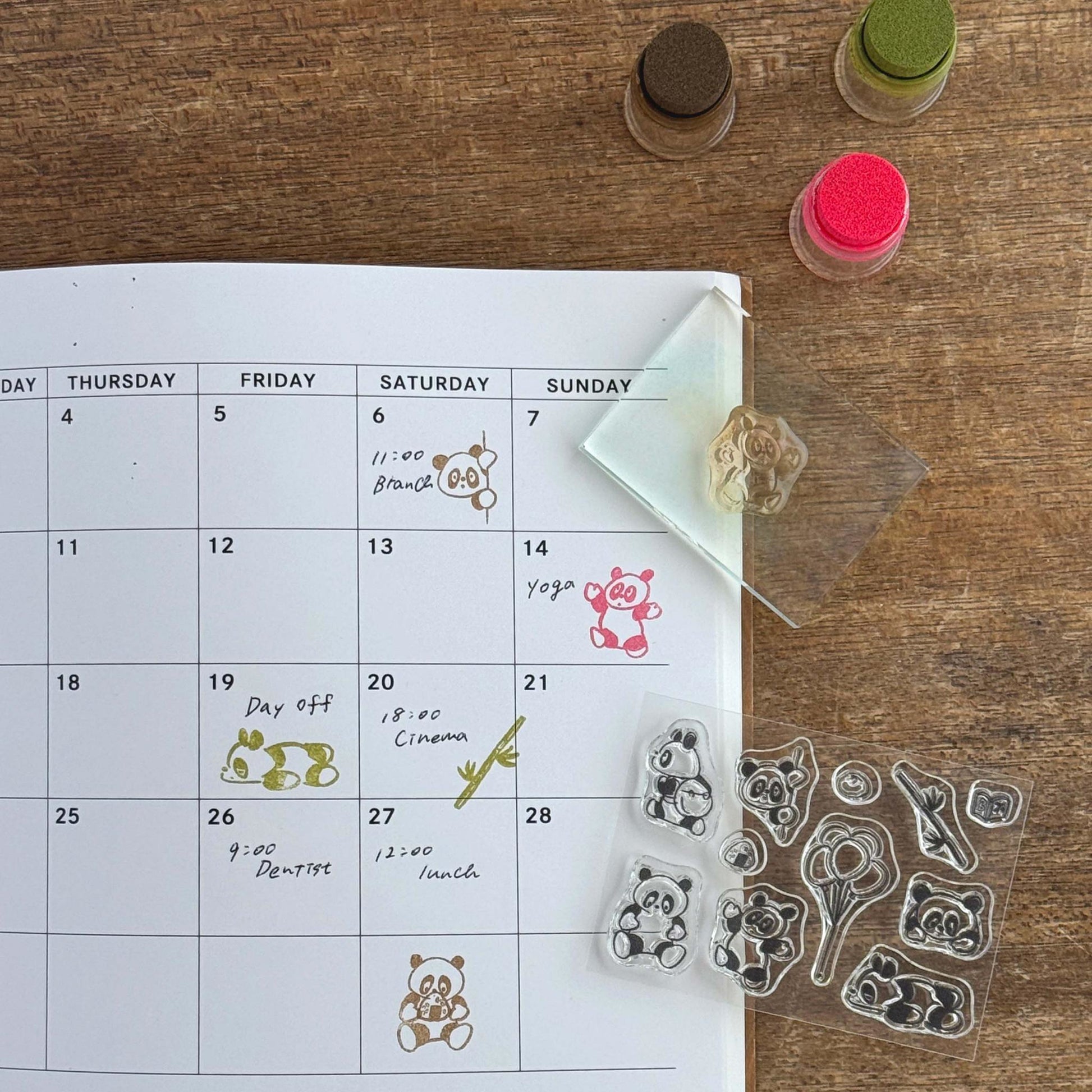 By attaching stamp parts to the acrylic block, you can stamp pandas in various poses. They add a lively touch to your monthly calendar pages or weekly schedule pages, making your usual plans more fun and cheerful. The acrylic block and the resin stamp parts are transparent, so you can place the stamps perfectly where you want to stamp them. Due to the characteristics of the material, delicate lines can be stamped beautifully. Enjoy stamping with JIZAI clear stamps freely!