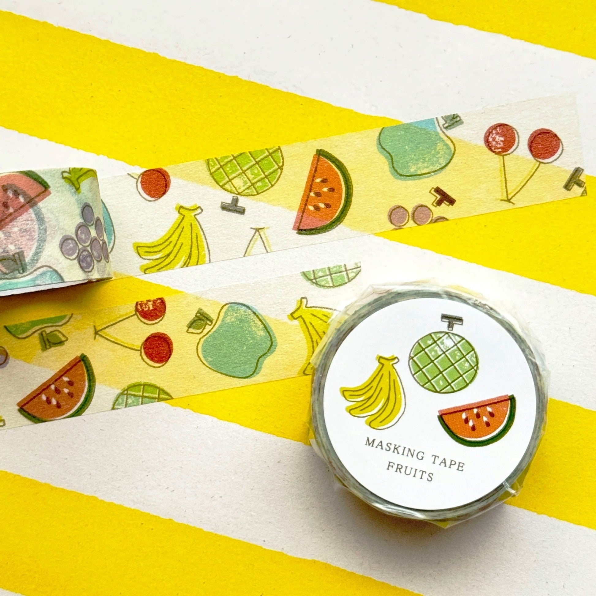 カラフルで愛らしいフルーツ柄を散りばめたマスキングテープです。