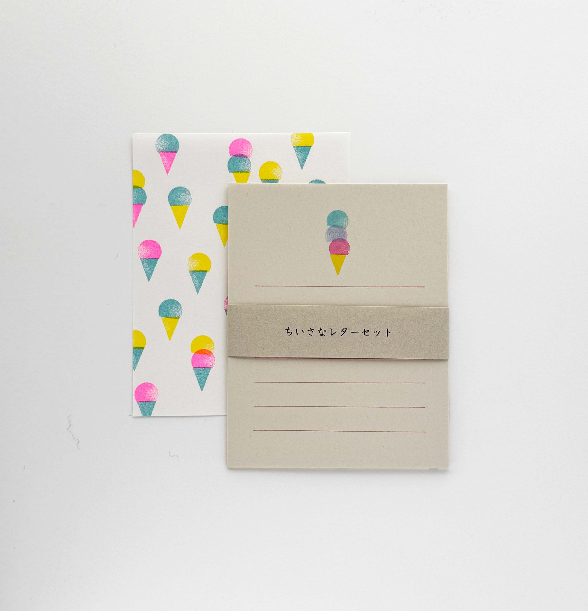 こぶりなサイズがかわいいミニレターセットです。ポップなアイスクリームをカラフルにデザインしました。わら半紙と白いハトロン紙に蛍光色のインクが映える2種類です。半透明の封筒に入れると柄が透けて見えます。