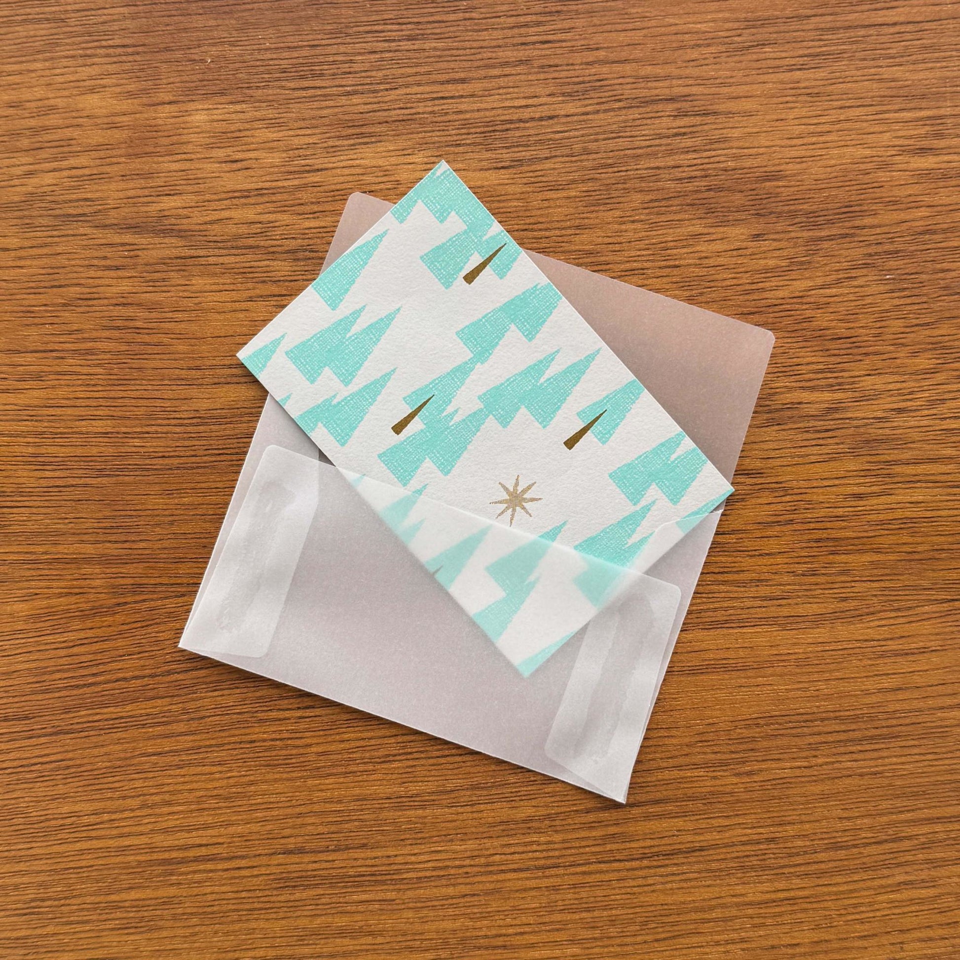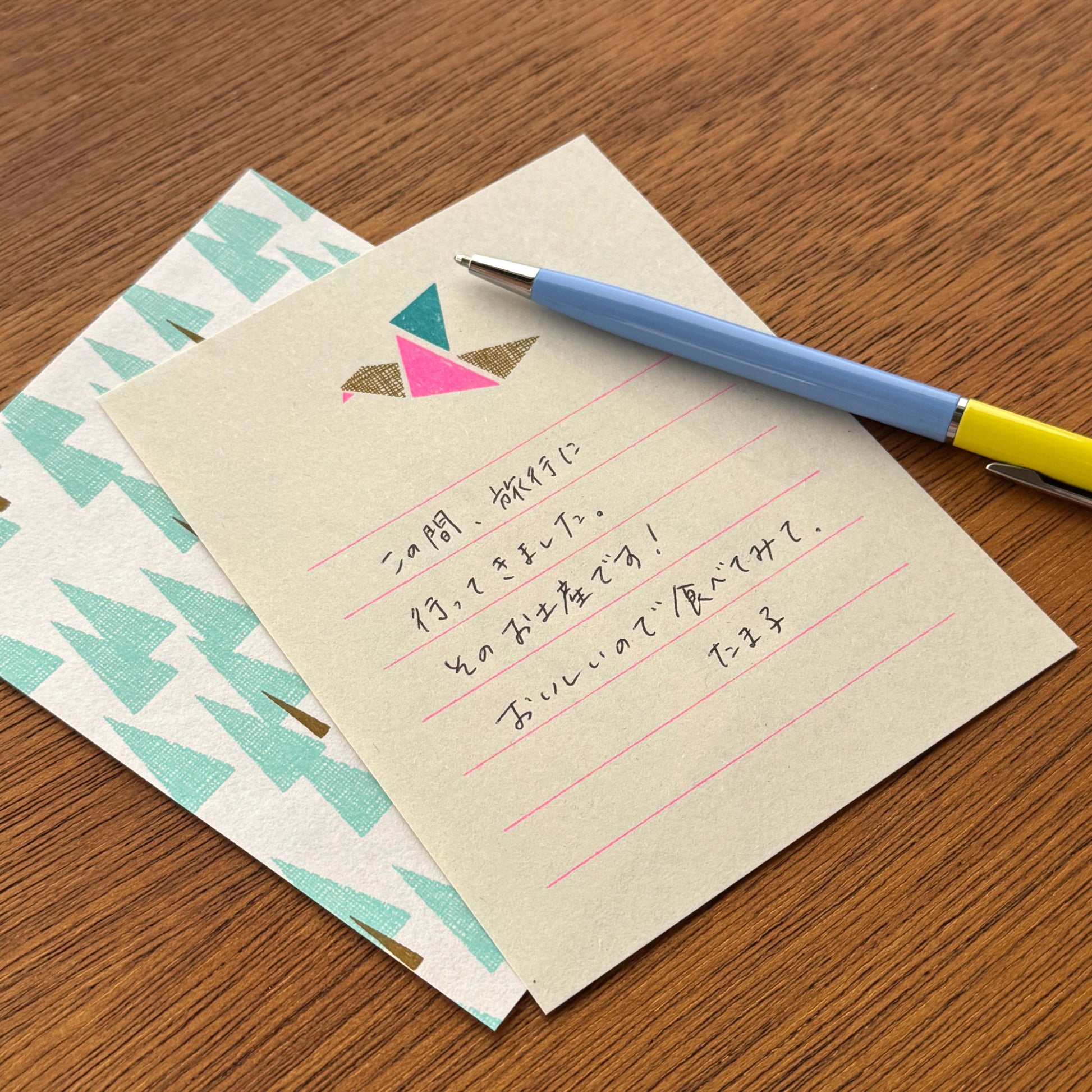 こぶりなサイズがかわいいミニレターセットです。静かな森と折り紙で折ったような鳥がデザインされています。わら半紙と白いハトロン紙に爽やかな色と蛍光色が映える2種類です。半透明の封筒に入れると柄が透けて見えます。