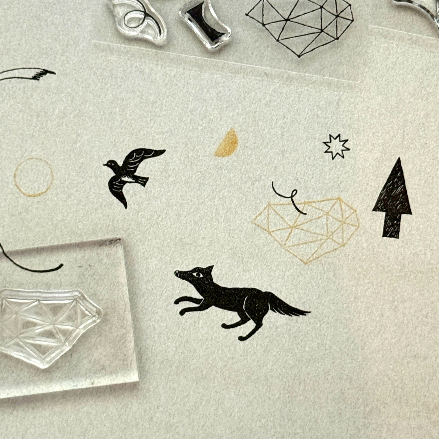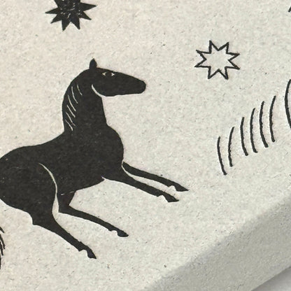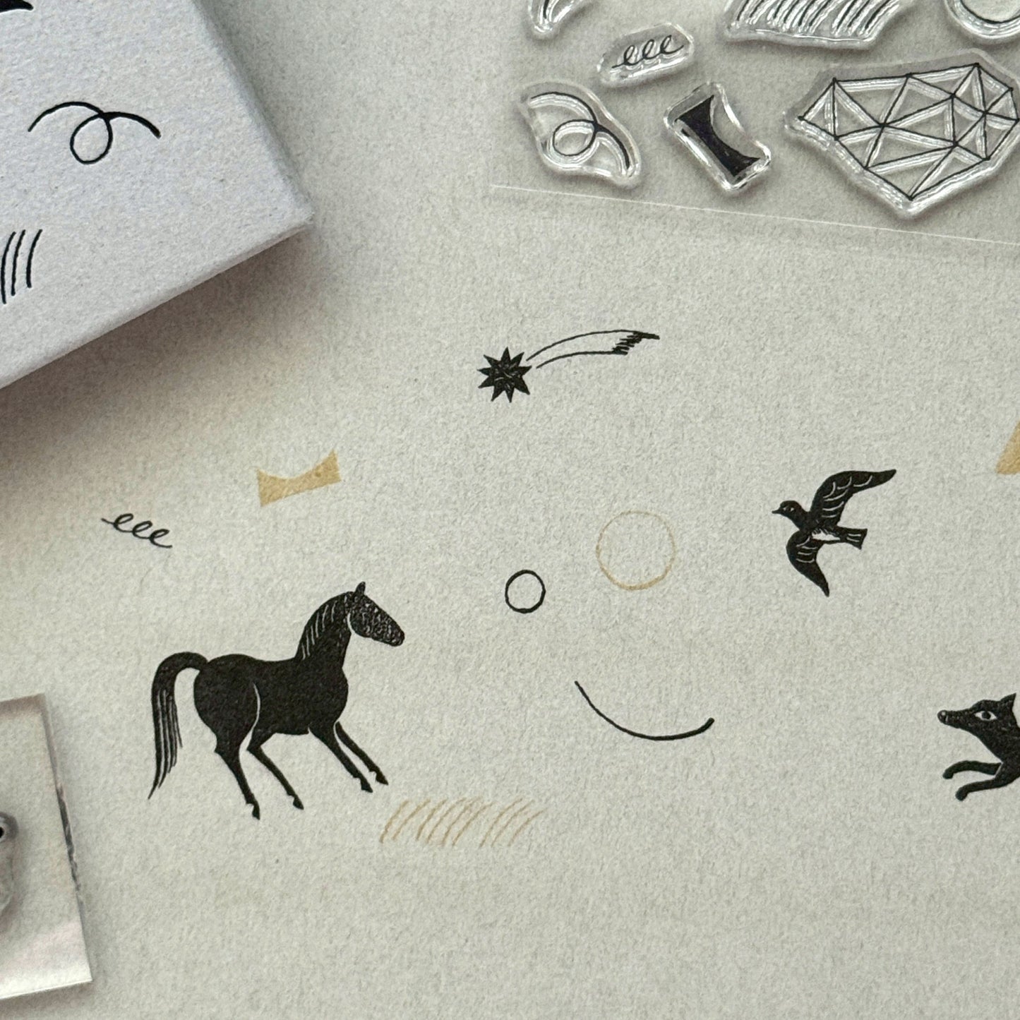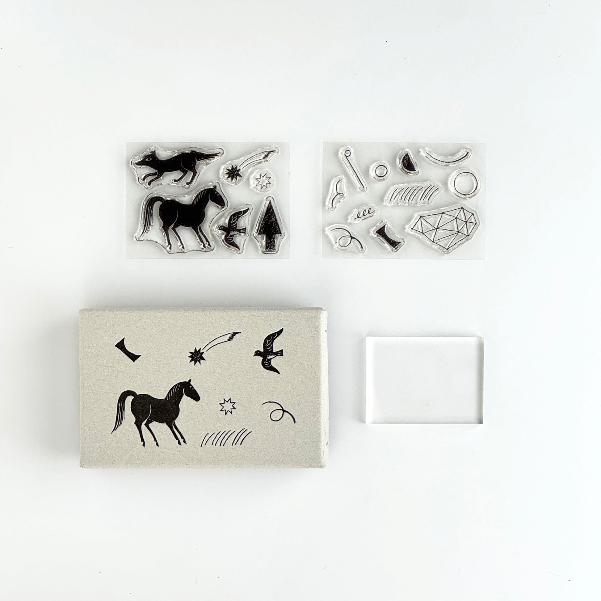 透明のアクリル台にスタンプシートを自由に貼りつけて、様々な図案を表現することができるセットです。イラストレーターの西淑さんに図案をお願いした「夜のあいだ」は動物たちが集う静かな夜をイメージしています。馬や鳥といった幻想的な雰囲気を纏った動物たちと、幾何学的なモチーフをたっぷり詰め込んだセットは、動物と幾何学模様を組み合わせたり、動物単体で押したり、幾何学柄だけでモダンなパターンを作ってみるのもおすすめです。