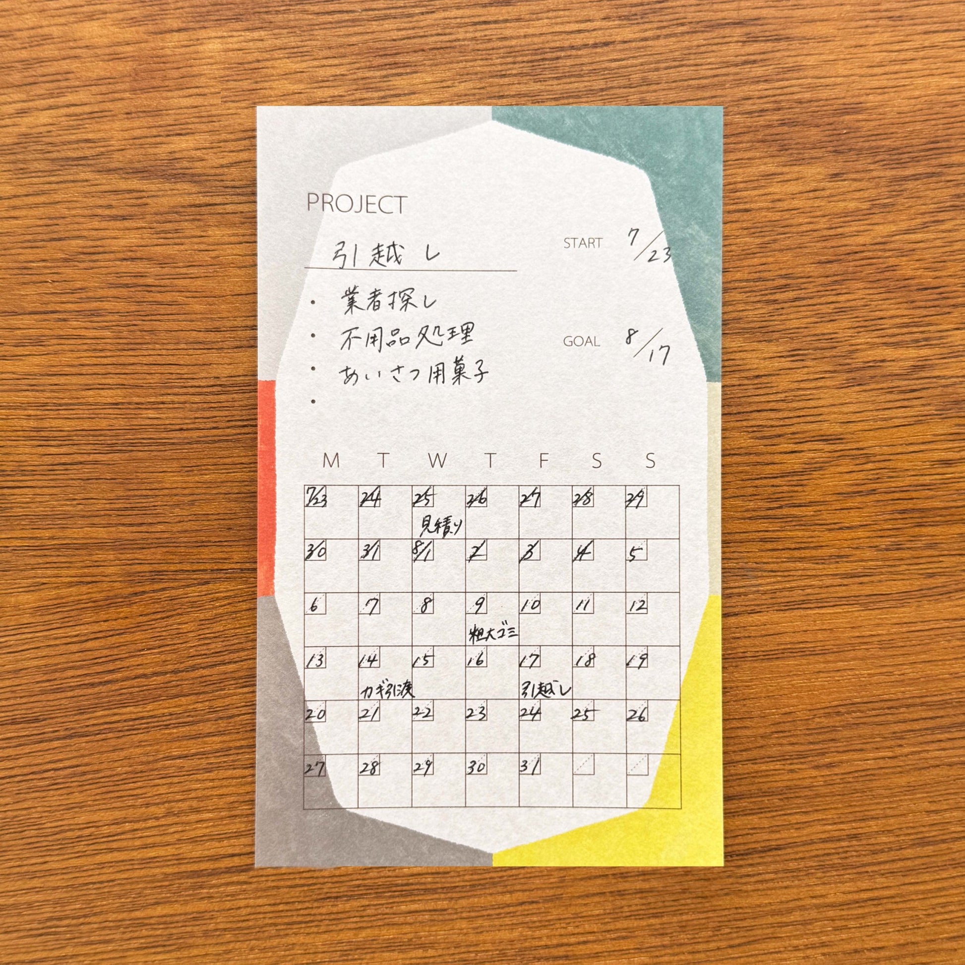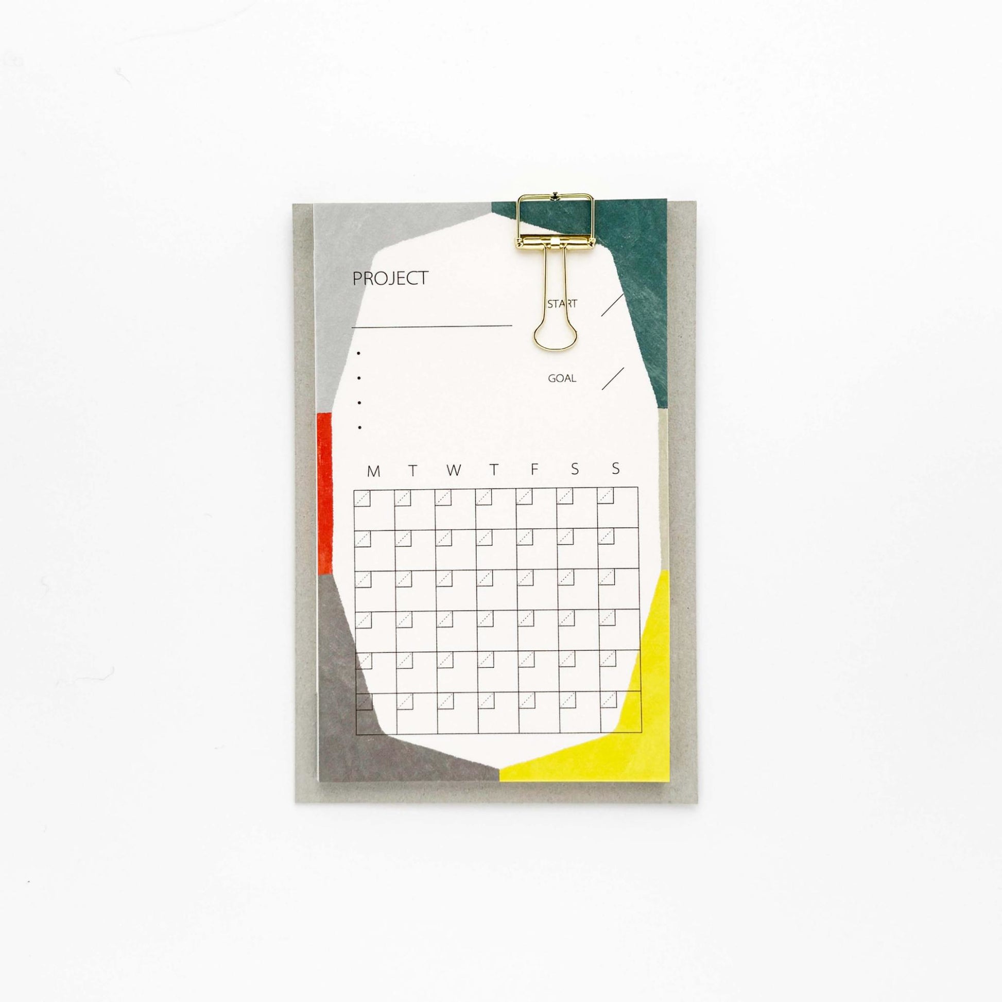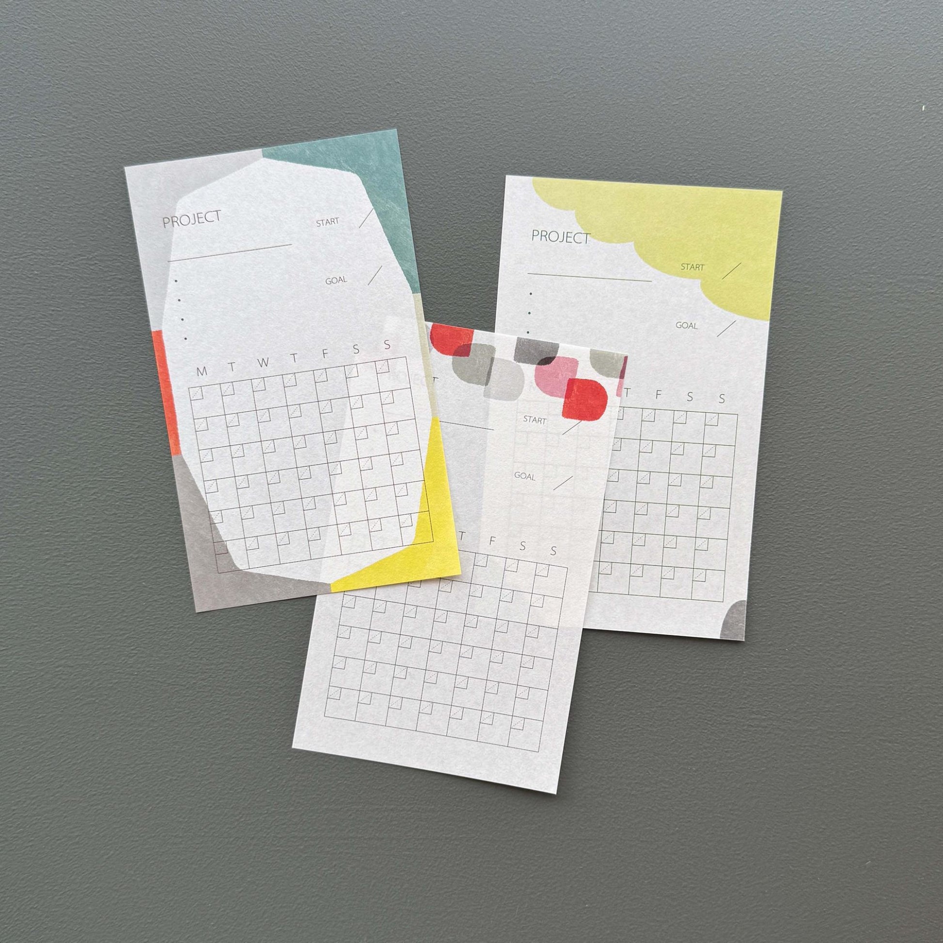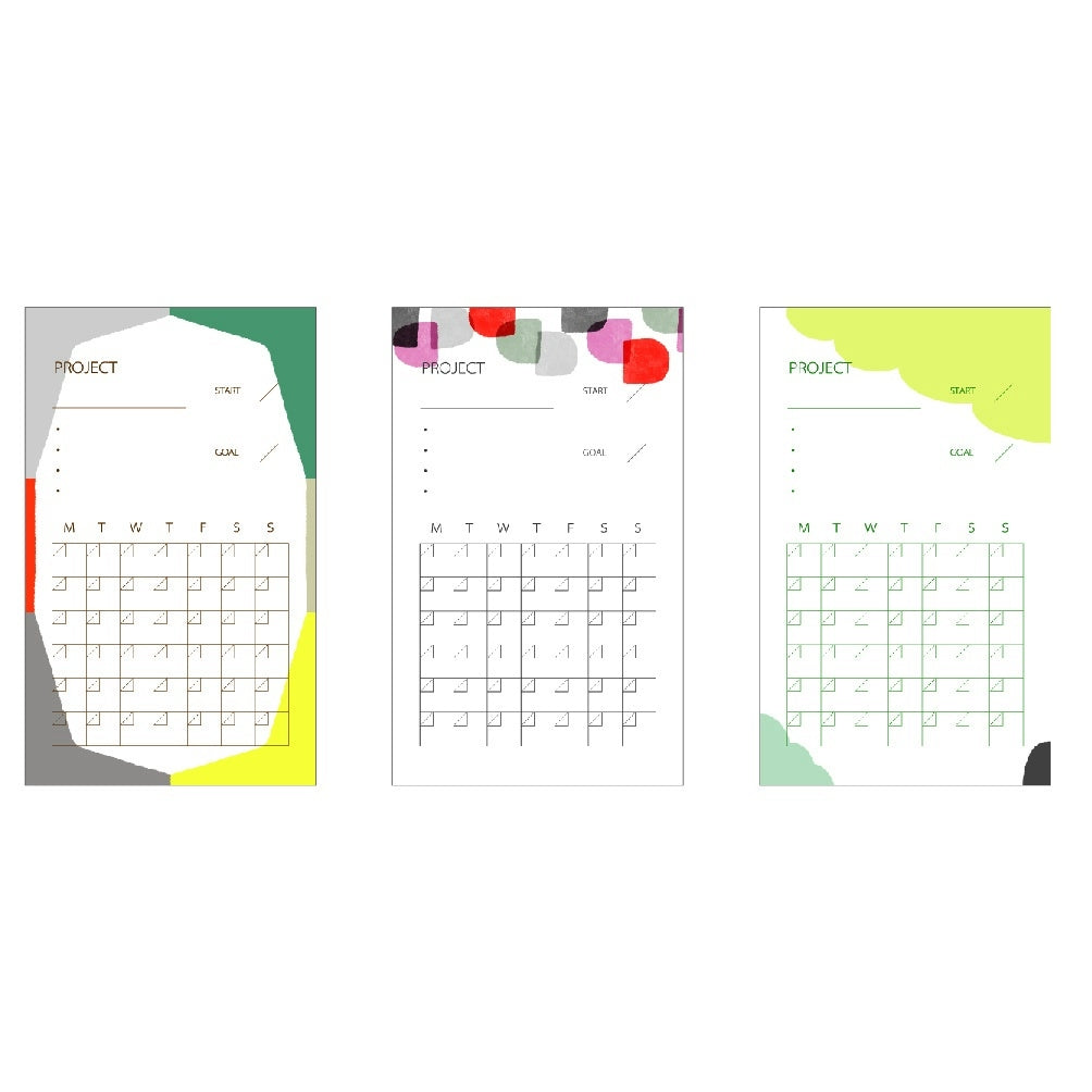 スケジュールをカレンダー形式で書き込むことができる壁に貼るメモに新柄が登場しました。1枚ごとにひとつのプロジェクトをあてがうことで、スケジュールと様々なメモをまとめて確認することができます。 何気ないスケジュールメモも、壁に貼ったときに小さなポスターのようになるように、カラフルなデザインにしました。 複数のプロジェクトを同時に貼り出しても区別がつくよう、デザインは3種類。 付属のクリップでまとめて保管してください。